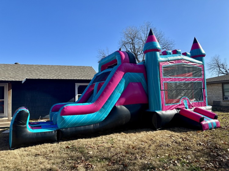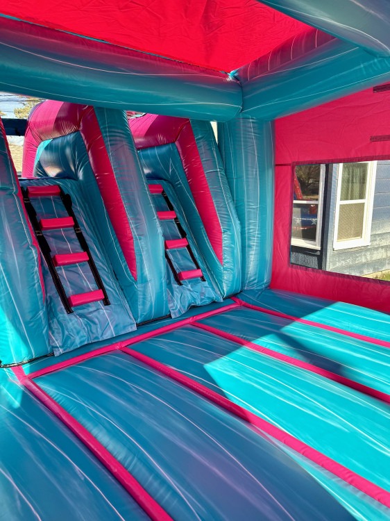 Our Miami Combo can be used wet or dry. This unit features dual lanes and can be set up with a pool or a slide stopper, making it great for all ages. Inside of the bounce house there is a basketball hoop that the kids will love.